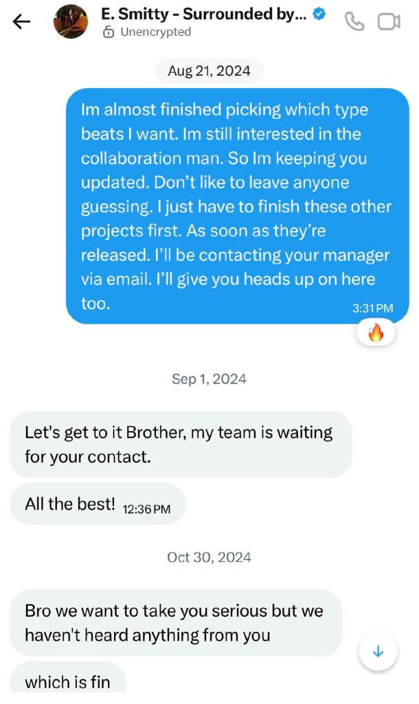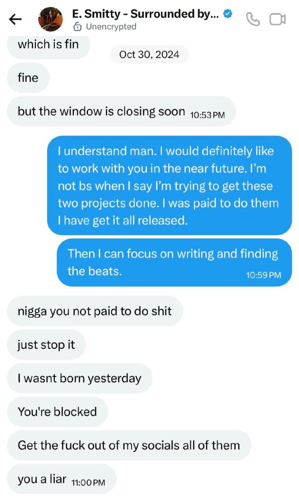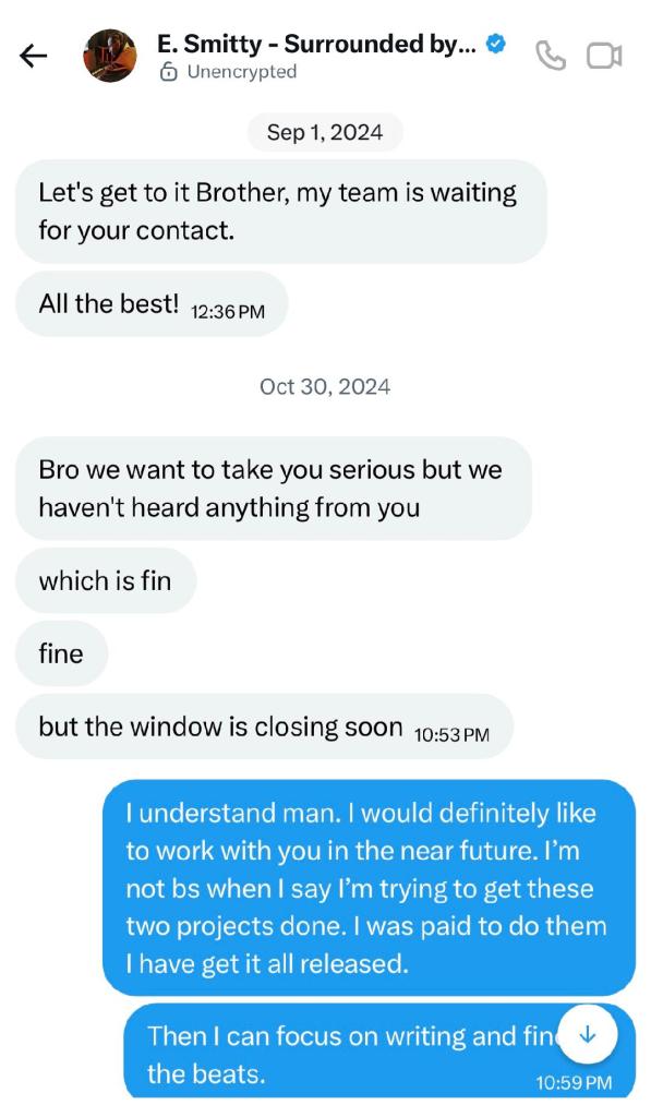 I recently released a new Ep in January. The Vingince Ep! On this particular ep I have my first ever diss track. I am not one to sneak diss someone. If I have a problem I address it. The fifth track on the album is I Do What I Want. I chose this title because I never wanted to be a part of the industry. I wanted to be successful but low key. I have done this pretty well so far. I never want to beef with anyone because I know where that leads from my past. I will not take straight up disrespect though and that’s why I did this. I unfortunately tried to collab with a so called producer. That goes by the name e smitty. He reached out to me and asked if I wanted to work. I always turn these things down because it’s almost a scam every time! This was no different I have a link here exposing this fool. This is from another blog. I will be showing you the screen shots below of our conversations. Then you can decide if I should have dissed this clown or not. Here is the website link https://raprehab.com/e-smitty-sound-alive-records-and-the-bad-record-deal-rap-rehab/